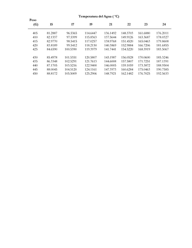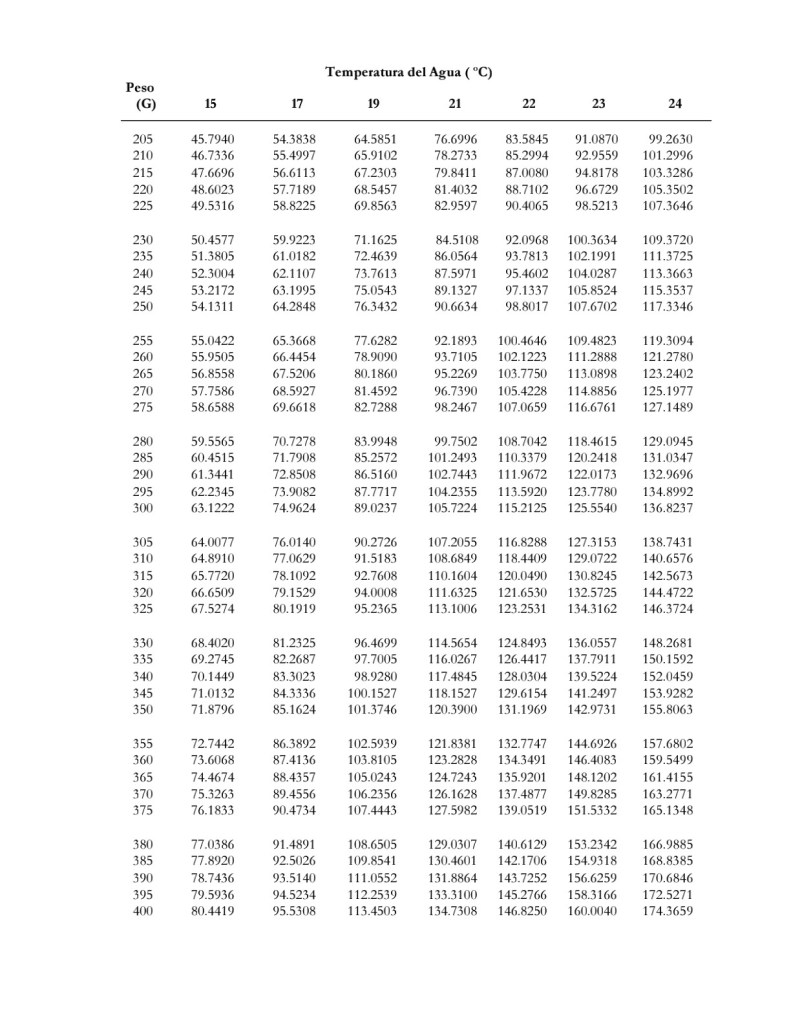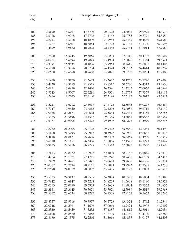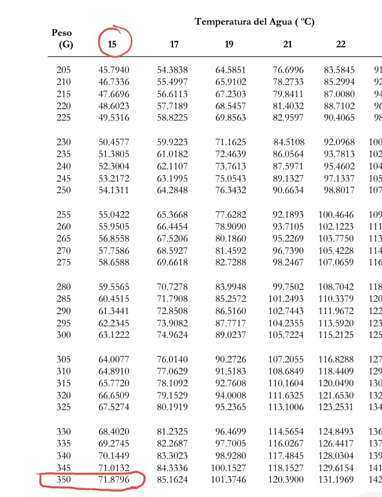 Posteriormente necesitamos conocer la cantidad de oxígeno que consume una trucha por hora conforme su peso (revisar los valores en la tabla que se comparte abajo) y temperatura. El valor de 72,000, lo vamos a dividir entre el valor encontrado en la tabla. Si el peso de nuestros peces es de 350 g con una temperatura de 15°C. El consumo de oxígeno ser de 71.8796 como se muestra en la siguiente foto.