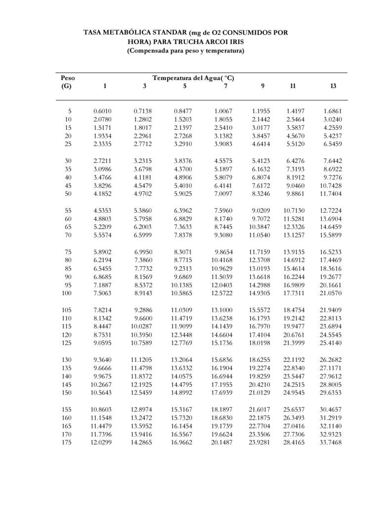 En la parte de abajo vienen las tablas de la Tasa metabólica estándar de consumo de O2 en mg. para trucha arcoíris.